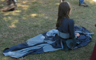 This is what one expects to find at a Medieval event: a girl with long, loose hair, wearing a 12th century bliaut inspired dresses with long hanging sleeves, made of linen or silk noil, trimmed with "Celtic" knot ribbon. It is not historically accurate, but it doesn't scream modern or break the illusion of being in a Medieval world (hence the "acceptable" classification). I love these types of dresses!