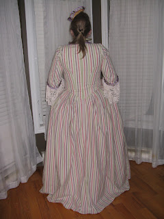 For those of you who might wonder about my hat and hair do, I tried making thread loops inside the hat to pull bobby pins through and stick the whole thing to my head, but it is not the best solution. I think in the future, I will add ribbons to tie the hat to to my head. As to my hair, I tried using a Bumpit to fake a little poof, but I need more practice using it.
